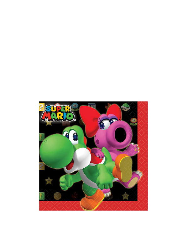 Don't let Mario and the gang slip and slide on those spills or messes, so hand out or place this Super Mario Brothers Beverage Napkins Pack of 16 on the table. Each of these beverage napkins come in black with a red border and feature Yoshi and Birdo. In the corner is the Super Mario logo with a scattering of Super Mario prizes in the background. Combine with our range of Super Mario party supplies including party cups, party plates, tablecovers and more.