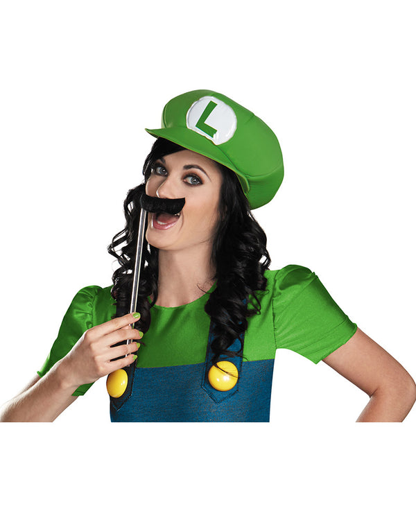 Zoom your way through Luigi's Mansion or bounce your way through the Mushroom Kingdom dressed in the iconic plumber get up in this Super Mario Brothers Luigi Deluxe Womens Costume. This fantastic costume includes a snug fitting jumpsuit styled to look like a blue jumpsuit with large yellow fake buttons on the front and underneath is a short sleeved green top. Also includes is a green newsboy style hat with Luigi's 'L' logo printed on the front, a pair of white short fingerless gloves with stuffed rolled cuffs and a hilarious black moustache on a white stick. Grab your brother (or sister) to dress as Mario or venture off to save Princess Daisy solo.