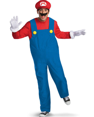 Protect Princess Peach and have fun doing it in this Super Mario Brothers Mario Deluxe Mens Costume. This costume features a blue jumpsuit with attached long red sleeves and yellow buttons. The jumpsuit comes with a detachable inflatable belly so you can decide how much of a pot belly Mario has today. A red cap with the iconic "M" logo on the front, black moustache and white gloves are also included to complete the look.