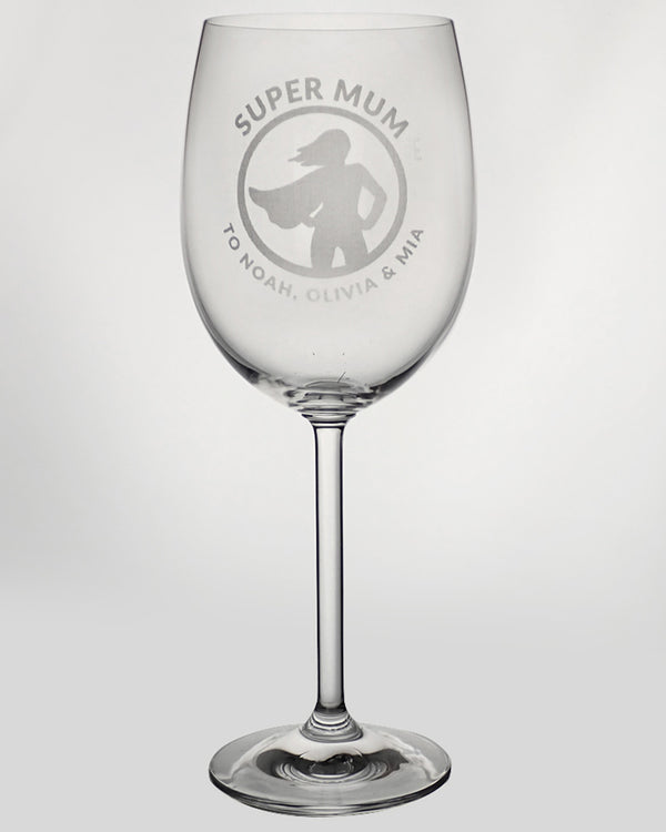 Show your appreciation and gift the hero in your life this Super Mum Engraved 360ml Wine Glass. With customisable name options, this glass has been designed so you can print important names of your choice under the "super mum" and hero print labels. Perfect for a gift, birthdays and much more.