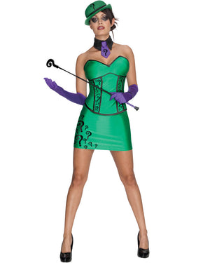 Become the sexiest villain this Halloween with this ultra sexy Super Villain The Riddler Womens costume. This naughty costume comes with a tight green dress with black question marks printed along right side and bodice, dark green collar with attached purple tie with a black question mark, green bowler hat, and purple elbow-length gloves. Watch out Batman, the Riddler is here!
