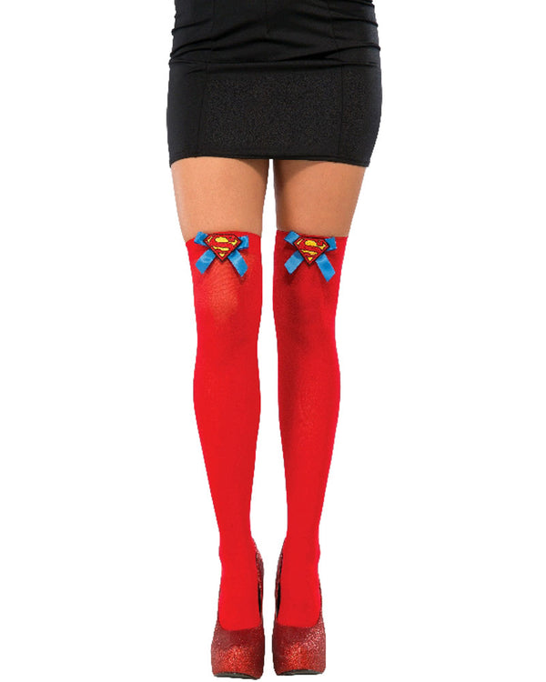 Complete your superhero look with these Supergirl Thigh High Stockings. These red thigh high stockings feature blue bows on the top with a Supergirl logo in the middle.