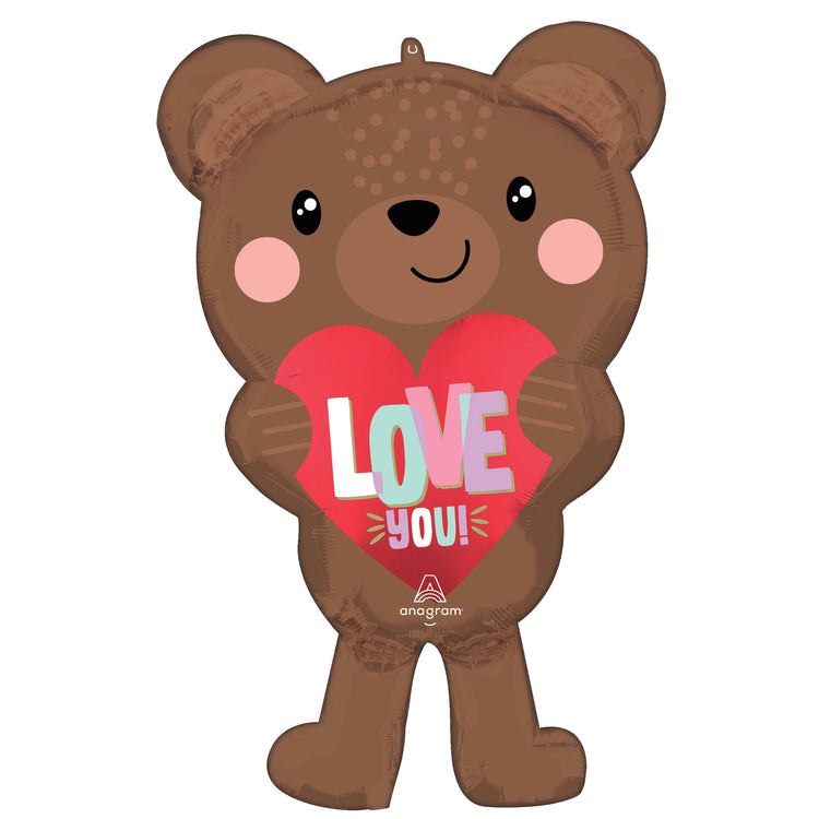 Express your love in the warmest hues with our Satin Brown Love You Bear 86cm SuperShape Foil Balloon. This bear-shaped balloon, featuring a satin brown finish and a heart that reads 'Love you!' is a delightful and charming declaration of affection. Let this lovable bear share your sentiments in the most endearing way, adding a touch of sweetness to your Valentine's Day celebration. Combine with our range of Valentine's Day balloons to mix and match and create the perfect scene for your party.