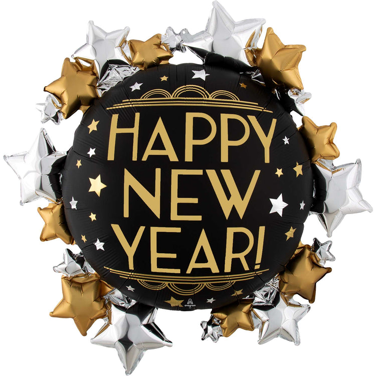 The SuperShape Satin Infused Happy New Year 76cm Foil Balloon is a sophisticated choice for any New Year’s Eve party. This black round foil balloon is surrounded by attached silver and gold star accents, creating a dazzling border. With “Happy New Year” text at the center, this balloon adds an elegant finishing touch to your festive decor. Combine with our range of balloons to mix and match and create the perfect scene for your party.