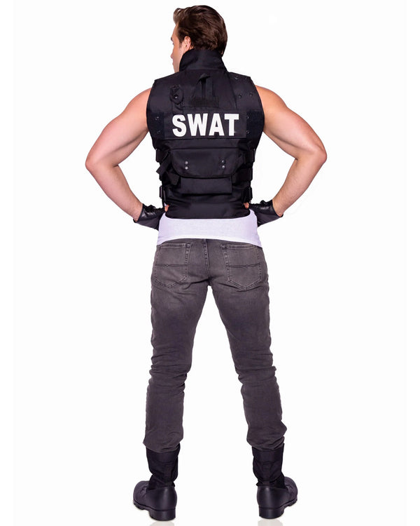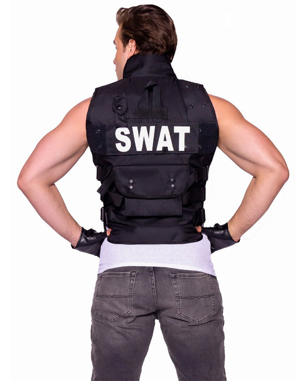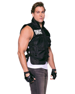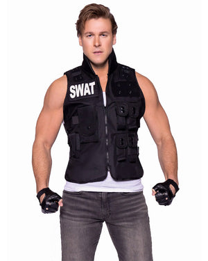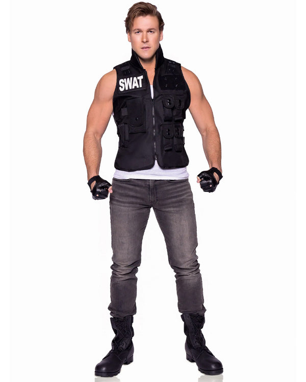 Step up and take command in the SWAT Commander Deluxe Mens Costume. This bold and authoritative costume features a black, realistic utility vest with a zip-up front and multiple functional pockets, perfect for storing your tactical essentials. The bold "SWAT" is printed in white across the chest and back. Complete the look with the included short faux leather fingerless gloves for that tough, no-nonsense edge. Perfect for those ready to take charge of the situation, whether it's a costume party or the crime scene. Complete the look with other accessories from our police or uniform range.