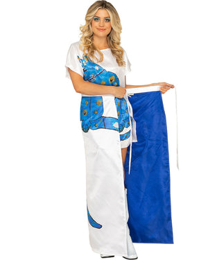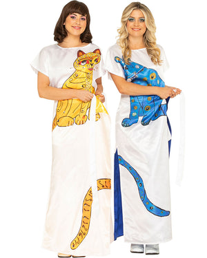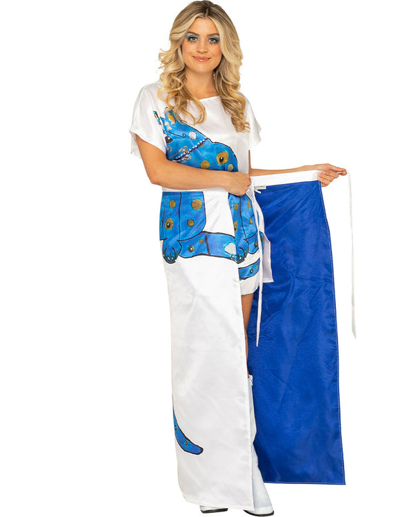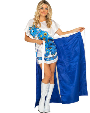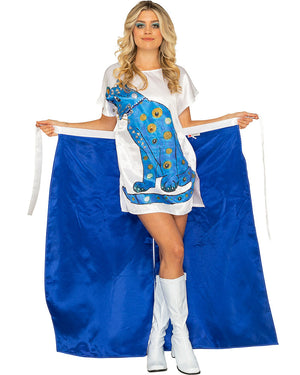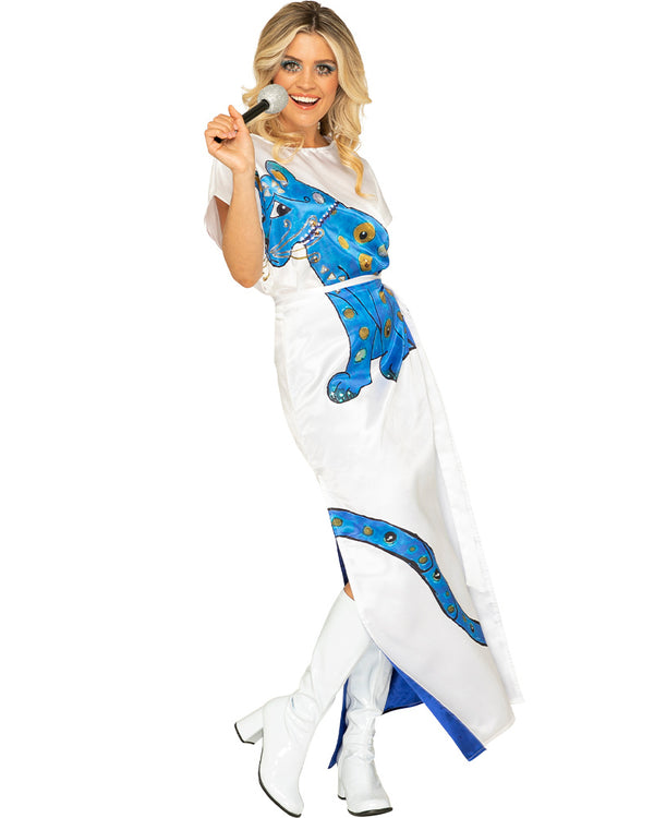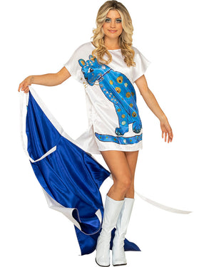 Who wouldn't envy your 70s outfit when you wear our iconic Swedish Superstar Complete Deluxe Blue Cat Plus Size Womens Costume. Inspired by Agnetha of ABBA, this incredible costume will have you dancing all night long in Swedish style featuring a large printed blue cat on a white silky tunic and a matching long white wrap skirt that ties on one side. The tunic is mini as it was intended to be without the skirt! We've designed this tunic to achieve the authentic and iconic Swedish superstar look we all know and love, so if you'll feel more comfortable, add booty shorts underneath. Plus, whether you wear the pieces together or just the tunic without the wrap skirt, your costume will still look complete as the skirt also features the bottom of the cat and its very long tail as well. Even better, the wrap skirt features striking blue lining and side splits to catch the eye, so as long as you're grooving to the beat, everyone will glimpse the stunning contrasting lining. If we still need to convince you this is the ideal choice for your next 70s or ABBA themed party, then why not pair it with our Yellow Cat and you've got yourself a fantastic group costume idea? Yes, we heard your prayers for this one!