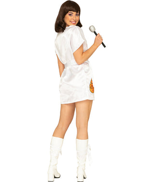 Here we go again bringing back the 70s with our incredible Swedish Superstar Yellow Cat Womens Tunic. You'll be the star of the night and the envy of all 70s party-goers with this ABBA inspired costume featuring a large printed yellow cat on a white silky tunic, a white belt tie to wear around the waist to accentuate your curves, as well as two matching white boot ties to wrap around your own pair of go-go boots. Yes, this tunic dress is mini as it was intended to be! We've designed this tunic to achieve the authentic and iconic Swedish superstar look we all know and love, so if you'll feel more comfortable, add booty shorts underneath. Pair with our Blue Cat and you've got yourself a fantastic 70s group costume idea.