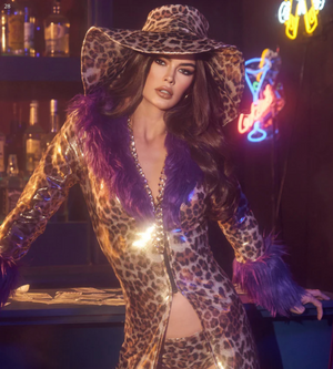 You'll certainly become the centre of attention while wearing our Sweet Mama Pimp Womens Costume. Featuring a shiny gold animal print coat with a front zipper closure and purple faux fur styled on the lapels and cuffs. The costume comes complete with a pair of matching hot shorts and a matching large floppy hat. Great as a sexy pimp costume. Complete the costume with a cane, oversized jewellery and accessories from our pimp range.