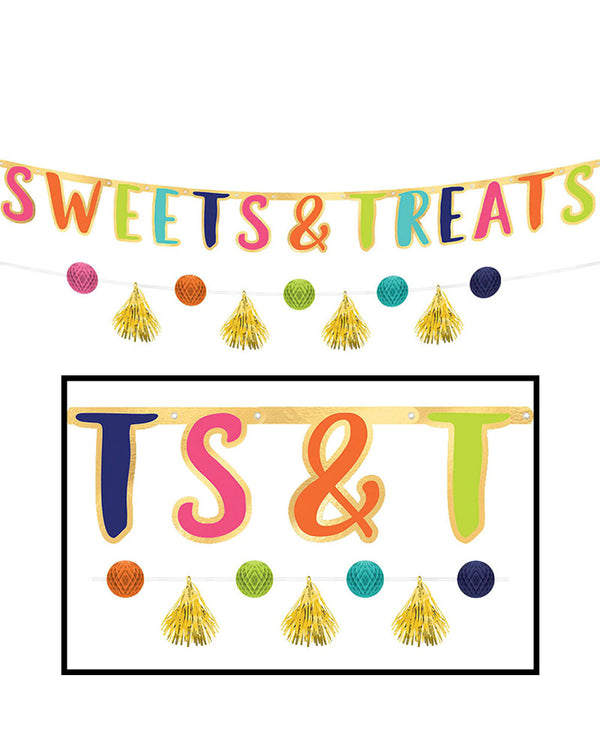You can't go wrong with our Sweets and Treats Banner Kit for decorating you're daughter's candy buffet. The banner decoration kit features a colourful lettered banner with the headline Sweets & Treats framed by metallic gold made from cardboard and a mini banner with attached round colourful honeycomb decorations and gold tassels! Check out our range of Sweets and Treats range for more!