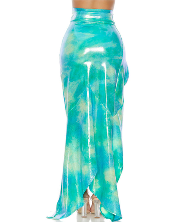 You'll be the most eye catching mermaid in the ocean when you wear this Swirl High Slit Mermaid Skirt. Included is a high waisted mermaid skirt in a two tone blue/green swirl print with mermaid inspired tail cut. The skirt also has a high side slit and side zipper closure.