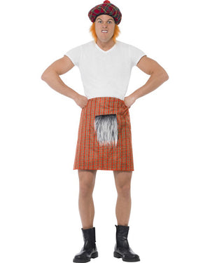 Don this red tartan Scotsman Kilt with sporran and it''s entirely up to you what you wear underneath. At least the Sporran is somewhere to keep your pack lunch. Add Tam O'Shanter hat and simple white tee.