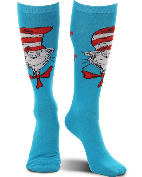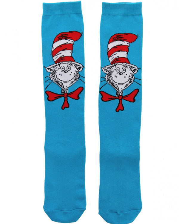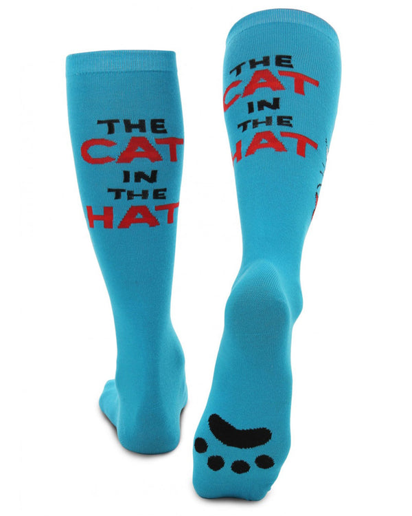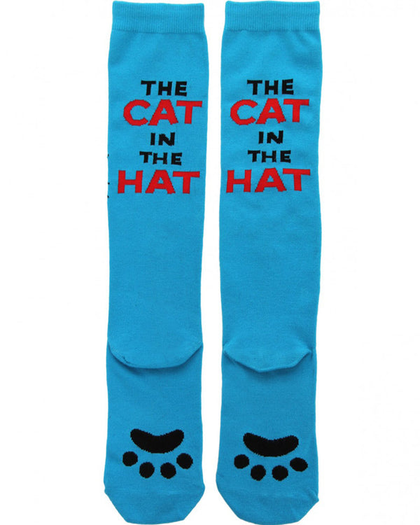 Jump around in our The Cat In The Hat Paws Knee High Costume Socks. The accessory makes for a great gift for any fans of the Dr Seuss classic or to finish up your cat in the hat costume. It features blue socks with Cat in the hat prints on the front and back and black paws printed on each sole.