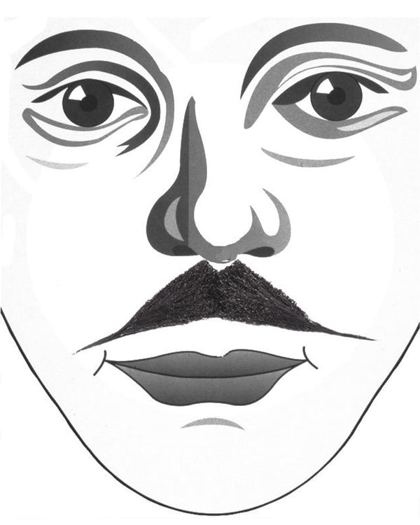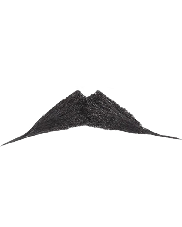 A narrow divided moustache that begins at the middle of the upper lip, with long whiskers pulled to either side of the centre. This 'twisted at the ends' look was traditionally achieved with wax. An English moustache was formerly used in melodramas, movies and comic books as a shorthand indication of villainy. Snidely Whiplash, for example, was characterised by his moustache and his cape. A great accessory to transform the face or complete an outfit. The moustache is applied using the double-sided tape attached. The moustache can be re-used, simply use a new strip of double-sided tape (not supplied).