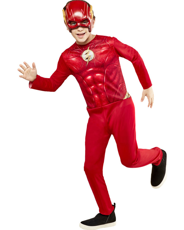 Speed your way through the multiverse... or your party dressed as The Flash in this The Flash 2023 Classic Boys Costume. This costume is based on the suit worn by Barry Allen aka The Flash in the latest DC 2023 film The Flash. The costume features a red jumpsuit with digitally printed muscles and shiny material based on the suit worn by The Flash. There is an included moulded plastic half mask with painted features based on the mask worn by The Flash. Around the back is an attached elastic strap with velcro fastening.