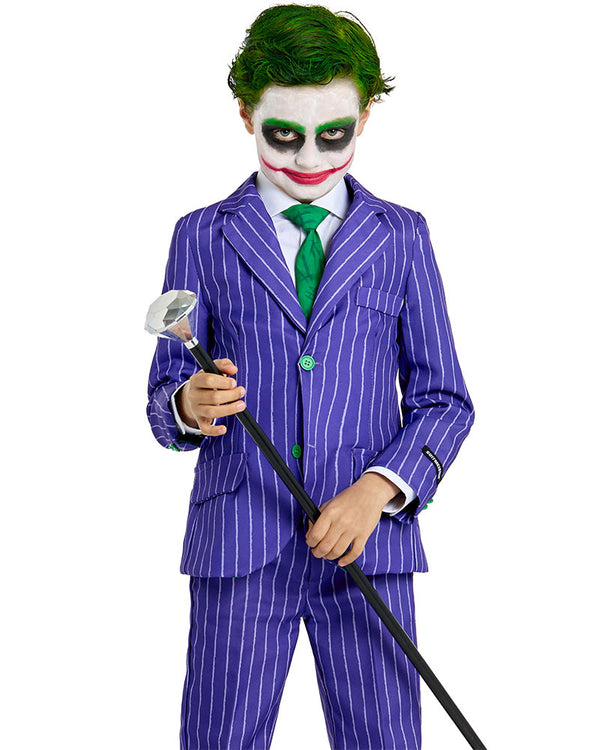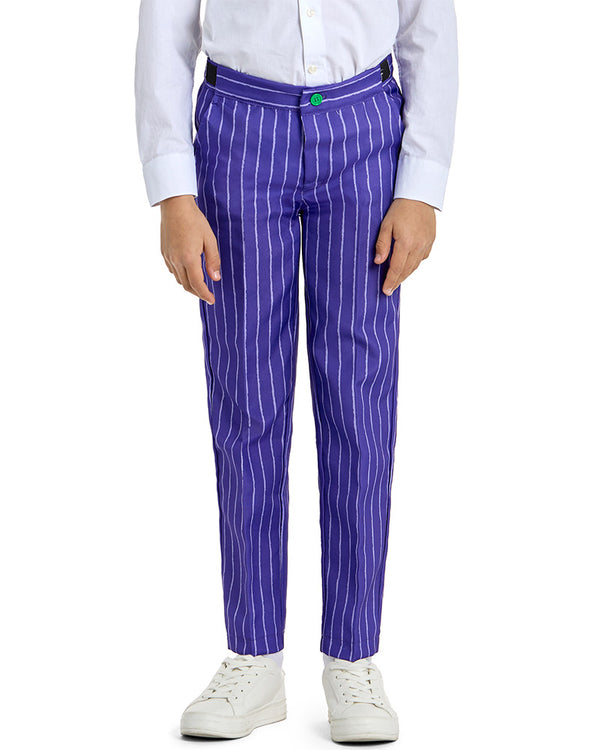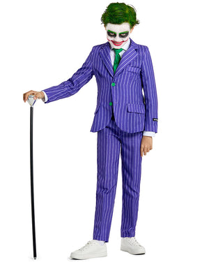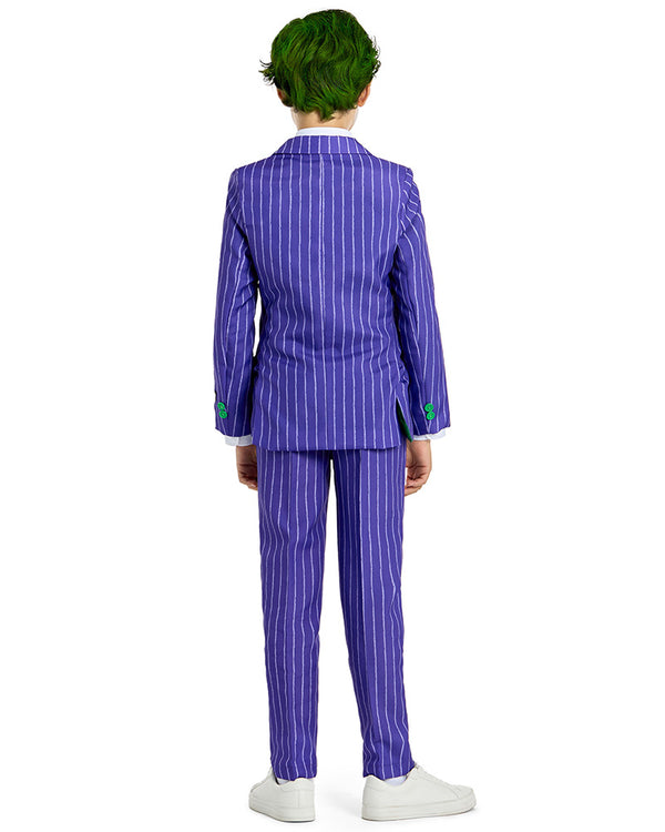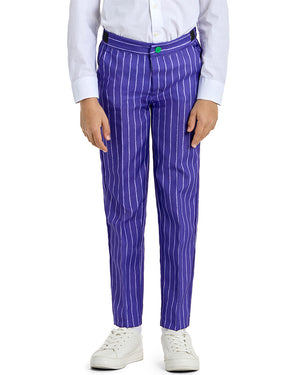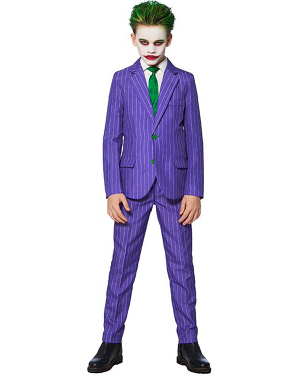If The Joker is your favourite Batman villain you would love our The Joker Boys Suitmeister. Featuring a purple pinstripe Suitmeister reminiscent of the Jokers classic look from DC comic and Dark Knight Trilogy, which includes a jacket with 2 green buttons, matching pinstripe trousers and a green tie! Just add a joke mask or makeup plus a joker's cane to finish the look! Why so serious! The jacket includes 2 fake pockets on the front, one inside pocket and 2 front pockets and 1 back pocket on the trousers! Both the trousers and jacket can be extended however as the waist is elastic the elastic adjusts to the wearer's size, for an easy fit!