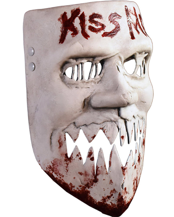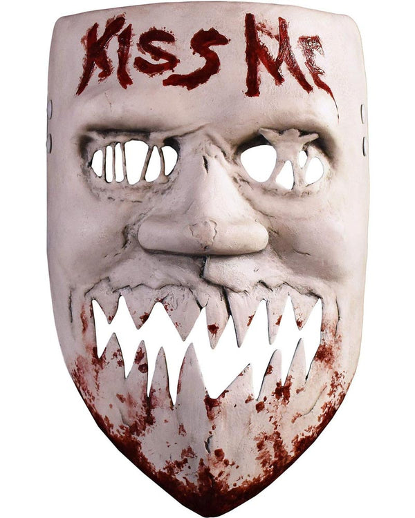 This The Purge Kiss Me Mask will have you looking as though you have walked straight out of the film The Purge: Election Year. The white mask with angular features with a row of sharp teeth, blood splattered along the bottom and 'Kiss Me' written in blood along the top. The mask is made from moulded plastic. There is an elastic band around the back to keep it in place. This mask is worn by 'Freakbride' in the film.