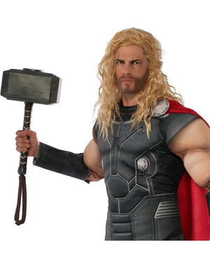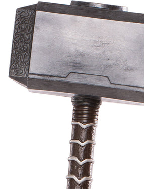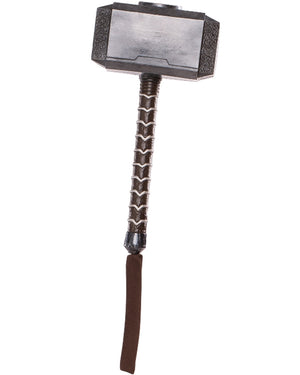 Show off your super human strength with this Thor Deluxe Adult Hammer. The hammer is made from molded plastic with painted details on the head. The shaped handle comes with an attached faux leather wrist strap.