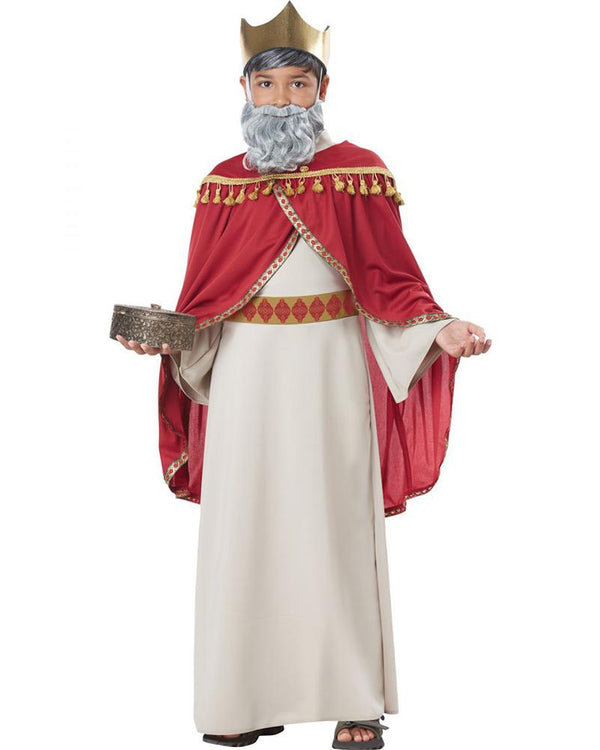 Recreate the nativity with this gorgeously detailed Three Wise Men King Melchior Deluxe Boys Costume. The King of Arabia, Melchior brings gold as a gift to the birth of the baby Jesus in the stable. With a gold crown, a red cape, and white robe with red detailing all included in the price of this costume, just add sandals, a long white beard, and bring your own little box full of gold coins to finish off the look. Pair with our other Three Kings costumes to round off the group.