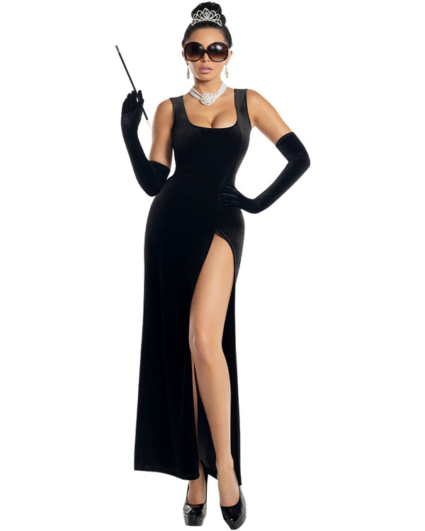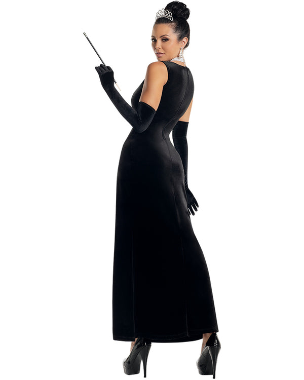The world will be your oyster in this stunning Tiffany Honey Womens Costume. Included is a black, sleeveless, velvet-look bodycon dress with a high leg slit, matching black gloves, a silver mini tiara, oversized sunglasses, cigarette holder, necklace and earrings. Just add black heels of your choice and you'll be ready for your grand and glamorous entrance to any throwback, letter T, or movie-themed party. Oh, and try not to feel too guilty for letting him dream on.