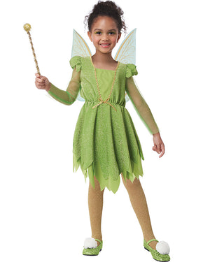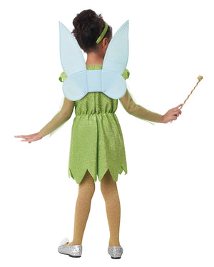 Spread some magic at your next party with this super magical Tiny Tinker Deluxe Toddler Girls Costume. The costume comes with a green dress featuring a glitter overlay, jagged hemline, gold trimming detail and puffed shoulders with sheer green sleeves. No fairy is complete without her wings so, of course, a set is included featuring a gold wing design on the side that faces the front and a blue back. To finish the costume, a pair of glittery tights and two show pom poms are included. Perfect for any tinkering fairy at Book Week or any Fairy themed party.