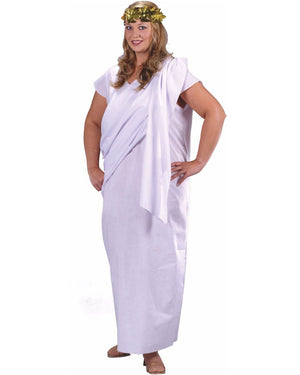 There ain't no party like a toga party. Get ready for a wild time with this Toga Plus Adult Costume for men and women. This Greek style tunic in white has a shoulder drape sewn right in, and the standard sizing is generously sized. The gold laurel wreath headdress will be your crowning glory and is also generously sized. The cheesecloth like fabric has been steamed in the image and needs to be styled to achieve this look. We advise white clothing is worn beneath this toga as the fabric is slightly sheer.