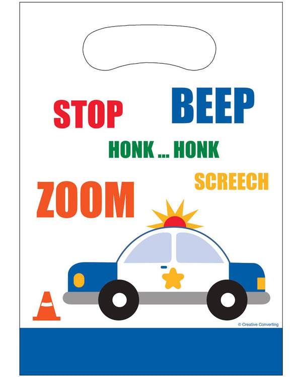 Fill these Traffic Jam Lolly Bags up with some lollies and party favours for your guests to take home from the party. These lolly bags feature a police car with the words Stop, Beep, Honk...Honk, Zoom, and Screech printed on a white background with a blue border. Combine with our range of Traffic Jam party supplies for an awesome birthday celebration for your little boy.