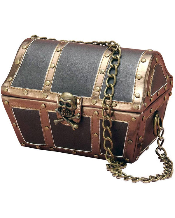 Keep all your treasure close at hand with this Treasure Chest Handbag. The bag comes in the shape of a brown treasure chest with bronze trim detail, a rustic chain and skull and crossbones pendant with velcro clasp at the front. Perfect for completing your pirate costume for Book Week, Halloween or any fancy dress party.