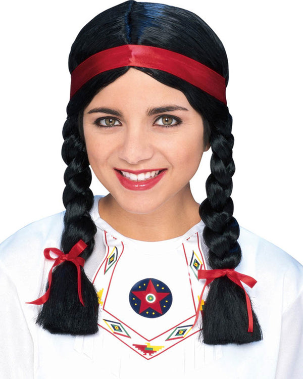 This Tribal Black Wig with Ribbons will transform your costume from good to great. A long dark wig with 2 fine plaits tied at the ends with a red ribbon. Perfect for Indian girl or woman costumes from Pocahontas to Tigerlilly. Fits children and adults. Wear a wig cap for added comfort and to keep your own hair under wraps.