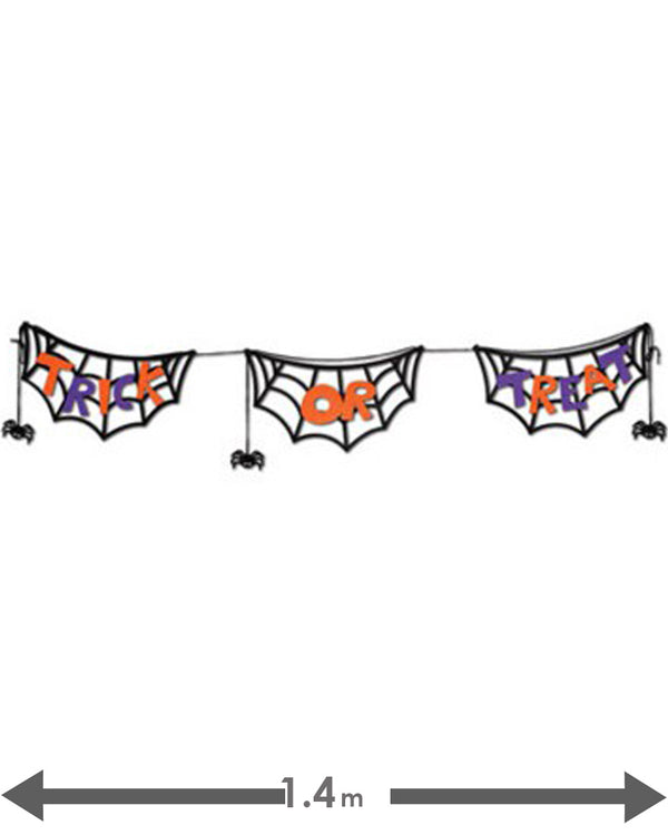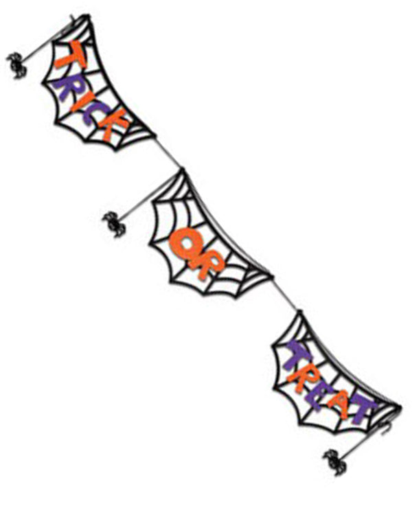 Let your trick or treaters know they're welcome at your place with this Trick or Treat Felt Banner. Make sure you've got plenty of lollies ready! The banner measures 1.4m long and 17cm high and features black spiderwebs with the words Trick or Treat in orange and purple. Hang indoors or outdoors and let the tricking and treating begin!
