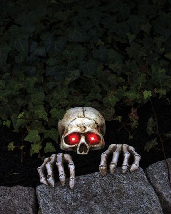 Skele Peeper Light Up Grave Breaker Set: Give any bypasser a fright with this perfectly placed Skele Peeper Light Up Grave Breaker Set. The set comes with a skull and two skeleton hands that can be placed in the ground with the included stakes. The prop is designed to look like a skeleton is peeking up from under the ground. You can also use this fantastic peeper prop indoors, just don't use the stakes. What's more, the skull eyes light up red for extra spooky effect so it's great to use in a dark room or at night time. Measures 68cm / 27in. Requires 3 x LR44 (1.5v) Batteries (included).