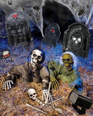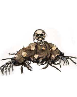 - Skeleton Grave Breaker Lawn Ornament: Get ready to jump out of your skin with this Skeleton Grave Breaker Lawn Ornament. This spooky prop will have your guests checking their feet aren't about to be grabbed. A plastic skeleton with a spattering of dishevelled hair draped in a cloth and mesh fabric to resemble a degrading shirt. The two arms are posable and can be put into a position best suited for their placement in your display. Also included is a yard stake for easy placement in the ground.
