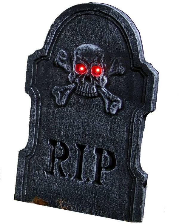 - RIP Skull and Crossbones Light Up Tombstone: Make your guests feel as though they've walked into a haunted graveyard with this RIP Skull and Crossbones Light Up Tombstone. The tombstone is dark grey and features the words 'RIP' and a large skull and crossbones with glowing red eyes. The decoration includes ground stakes to keep in place.