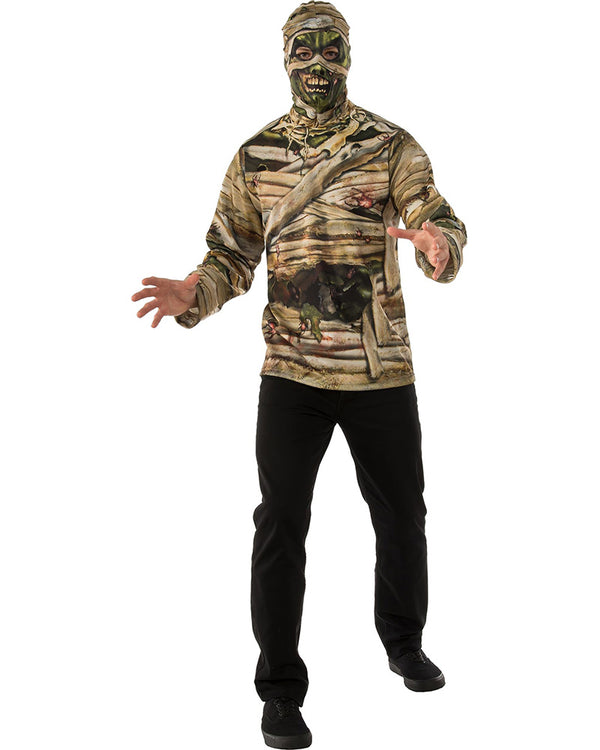 You'll rise from the tomb this Halloween when you wear this Undead Mummy Mens Costume. The costume features a digitally printed long sleeve top with images of wraps and bugs crawling out to give a gruesome mummified look. Also included is a headpiece printed with mummy bandages that covers the whole face with two eye hole cutouts.