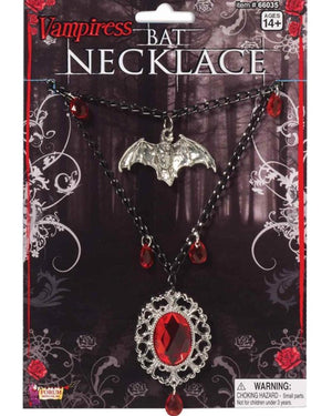 As you prowl the night, searching for your next meal, make sure you accessorise your neck when you wear this Vampiress Bat Necklace with your fabulous vampire costume. This necklace comes with a black two layer chain with some deep red pendant stones along the chain. Attached at the top chain is a silver bat shaped hanging pendant and attached at the bottom layer is a large round silver decorative pendant with a deep red stone in the centre and a smaller one hanging at the bottom.