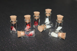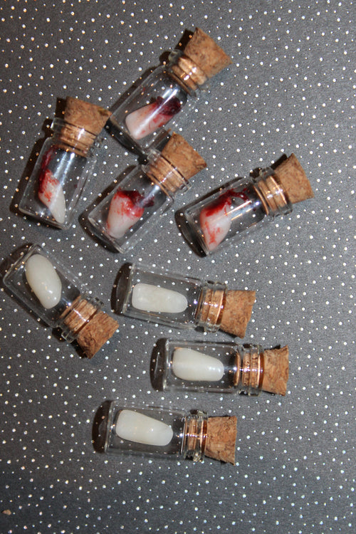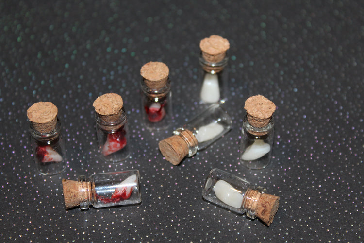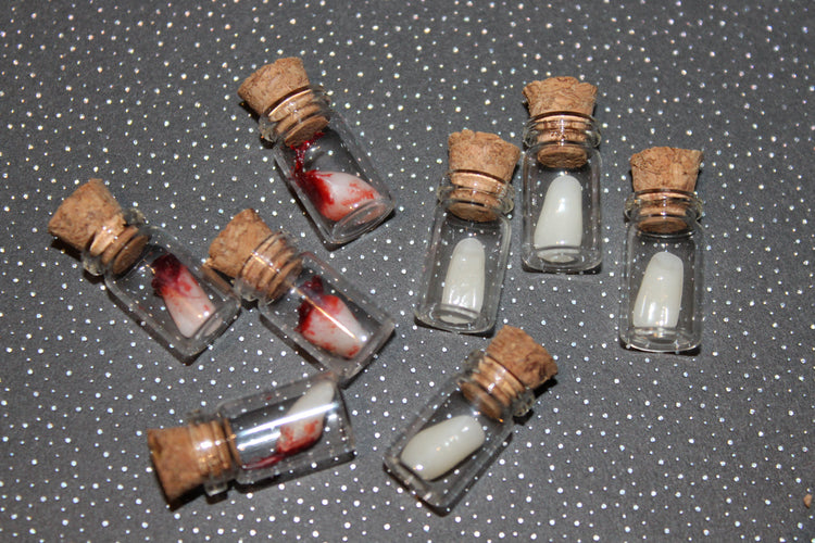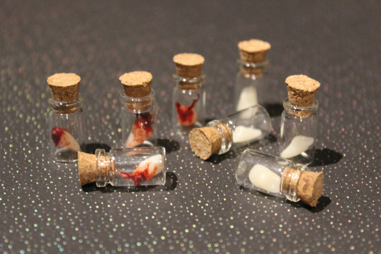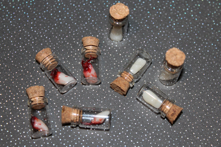 - Mini resin specimen jars with a fake bloody tooth inside each.