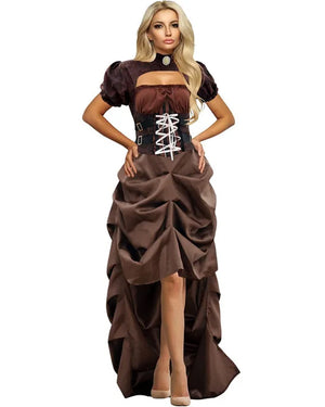 You'll certainly look the part for any Steampunk event in this Victorian Steampunk Womens Costume. The costume comes with a brown dress featuring a ruffled bustle-like skirt that's high in the front and long at the back, as well as a brown bolero-style top with an underbust corset effect over the blouse and featuring buckles and lace-up detail and puffed sleeves. Add your own extra Steampunk flair like some goggles, faux leather gloves and boots and you're set to stun at your next event.