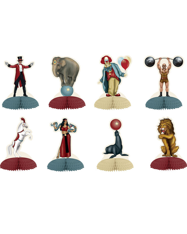 Add this gorgeous Vintage Circus Mini Centrepieces Pack of 8 to your party. Each centrepiece is different, featuring characters like a ball balancing seal, a ringmaster, a snake charmer, a dancing horse, a strong man and more. This set of mini centrepieces is perfect for any Vintage Circus themed party!