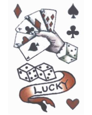Add some luck to your next high roller costume with this great Vintage Lucky Temporary Tattoo. Wearing this tattoo will surely make the dice roll in your favour. Simply cut around the design you want and apply with water.