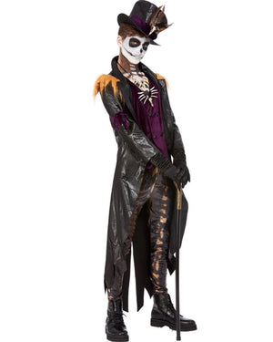 You'll have one foot on the other side with this Voodoo Witch Doctor Deluxe Mens Costume that's perfect for connecting with the spirits this Halloween. The costume comes with a black long tailcoat jacket in a wet-look material with an attached purple mock top and feather detail at the shoulders, a matching black top hat with a purple hatband and feather detail, as well as a pair of wet-look trousers in a snake-like print and a tooth necklace to top off the costume. Finish off the costume with some of our face painting kits, gloves and a cane! Perfect for black magic and making deals none who enter can escape from.