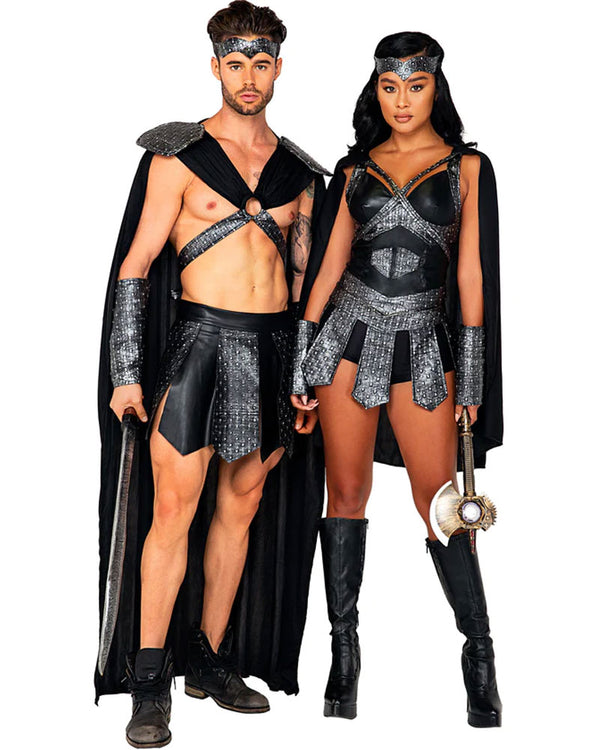 Conquer foreign lands wearing our Warrior Princess Womens Costume. Featuring a black bodice with a grey metal armour print, a matching belt with cascading panels, black booty shorts, 2 matching gauntlets, and a crown headpiece. Finish the look with a pair of black boots and your weapon of choice to protect you on the battlefield.