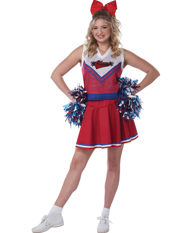 Let the partygoers know your spirit wearing this We Have Spirit Womens Costume. This costume features a red and white vest with blue detailing and 'Cheer' printed in the centre. There is a pleated red skirt with white, blue and red stripes along the hem, a large red bow for your hair and a pair of blue, red and white pom poms. Slip on your white shoes and socks to finish the look.