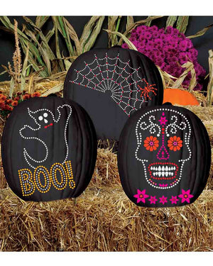 Create your own Halloween pumpkin with this Web Paint and Jewel Pumpkin Kit. The kit includes black paint, a sponge and a set of self-adhesive jewels that create the shape of a silvery spider web with an orange spider. Paint your pumpkin using the black paint then peel off the jewelled design and stick it on your pumpkin. No carving is necessary which makes this kit a great way for younger kids to get invloved in the jack-o-lantern fun.