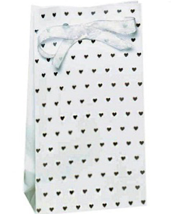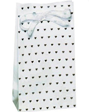 Add a touch of simple affection to your event with these Wedding and Anniversary Tender Love Paper Favour Bags. These white bags feature silver foil hearts and tie up with white ribbon. Combine with other boutique party supplies for a coordinated and sleek look.