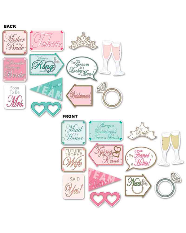 Celebrate a wedding shower or a hens night with these super fun Wedding Shower Photo Fun Signs. These reversible signs are printed on both sides and are up to 22cm / 9in high each. The pack also includes 4 wooden dowels.