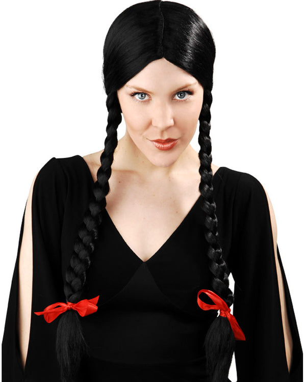 Match this Wednesday Addams Plaits Black Wig up with one of our costumes for a fun look this Halloween. Wear a wig cap and a deadpan face!