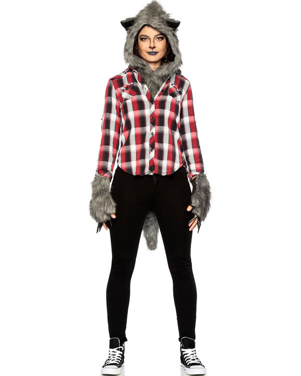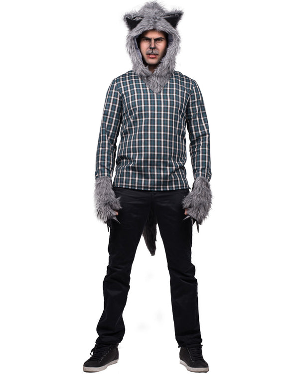 Get ready to howl at the full moon when you wear this Werewolf Adult Hood Gloves and Tail Kit. Included in this kit is a plush faux fur werewolf head with 3D ears and grey fur, as well as a pair of faux fur fingerless gloves with black claw details and a werewolf tail.