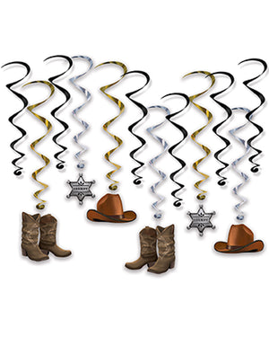 Every western party needs our Western Hanging Swirl Decorations Pack of 12. The decoration idea features a pack of 12 swirls of which 6 feature black swirls and 3 silver swirls and 3 gold swirls attached to cutout's including sheriff badges, cowboy boots, and cowboy hat! Just hang from the ceiling for any Western themed special occasions! Check out our range of Western décor and tableware for a coordinated look!