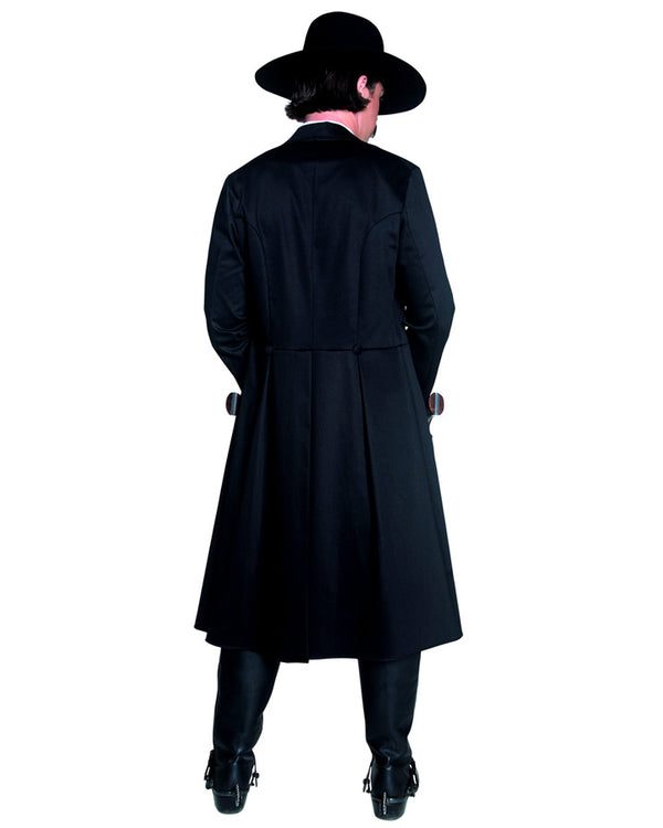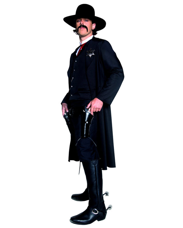 Don this Western Sheriff Mens Costume for a bit of cowboy fun. An authentic looking long line jacket in black with a white shirt insert and red necktie. A black vest with chain and pewter coloured buttons is also included, along with a sheriff's badge of course! Add a hat and your own black jeans.