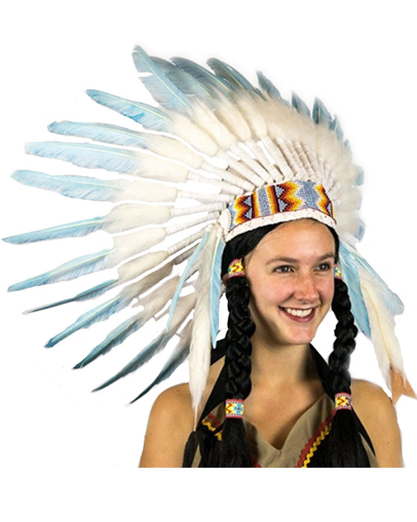 Get into the festive mood and dance the night away in this White and Turquoise Small Native American Headdress. A beautiful headdress of traditional Native American design made with a great amount of care and high attention to detail. The headdress features genuine Turquoise feathers extending from white fur embellishments, which is all supported from the base of the multicoloured headband. You will look the part in this well designed accessory.