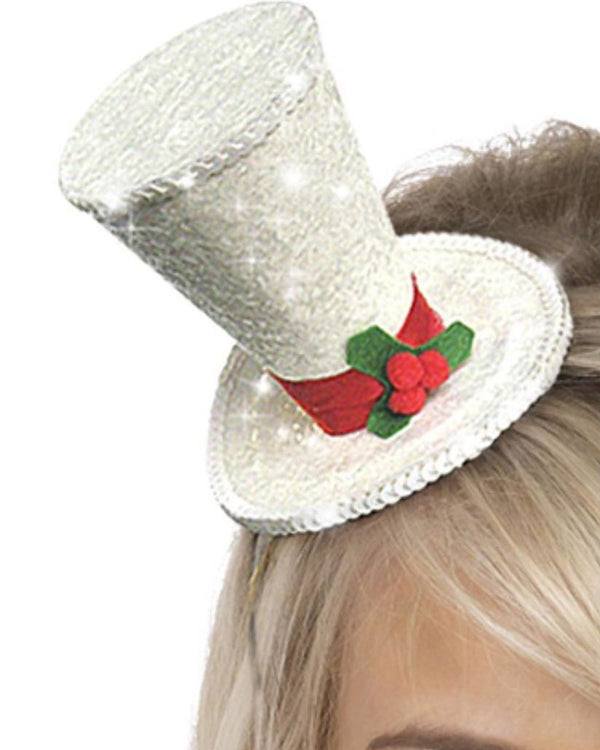 Top off your Christmas party outfit with this sparkling White Christmas Top Hat Headband. The mini top hat is attached to a headband for ease of wear and features a white glittered finish, as well as a red hatband and attached felt holly berry and leaves embellishment. Perfect for Christmas celebrations to look stylish and festive at the same time.